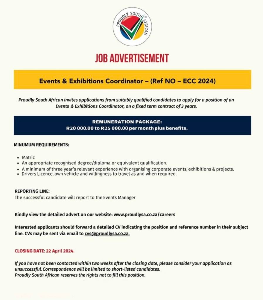 Proudly South African invites applications from suitably qualified candidates to apply for a position Events and Exhibitions Coordinator.